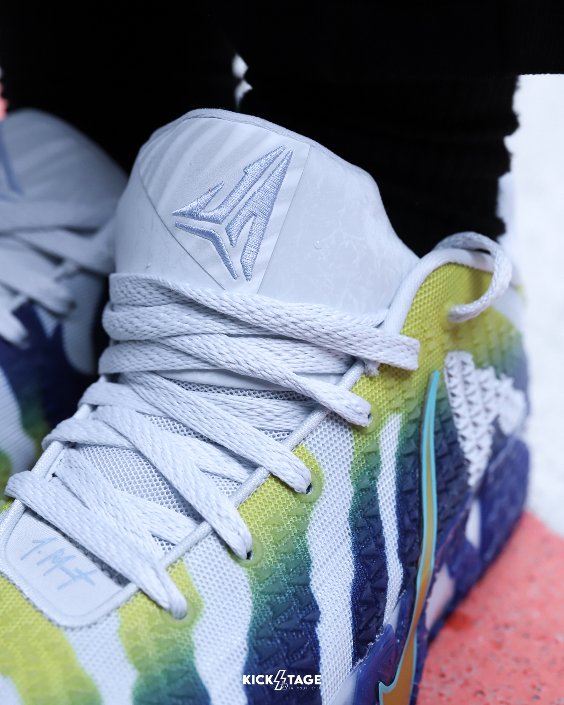 Ja 深知 Ja 3 經過微調的局部外底設計,能為他帶來助力。 Ja 說:「有這樣的抓地力加持,我可以隨時突破防守。」 抓地力紋路搭配滿版迷你 Ja 標誌,讓他輕鬆收拾對手,在比賽中留下自己的印記。