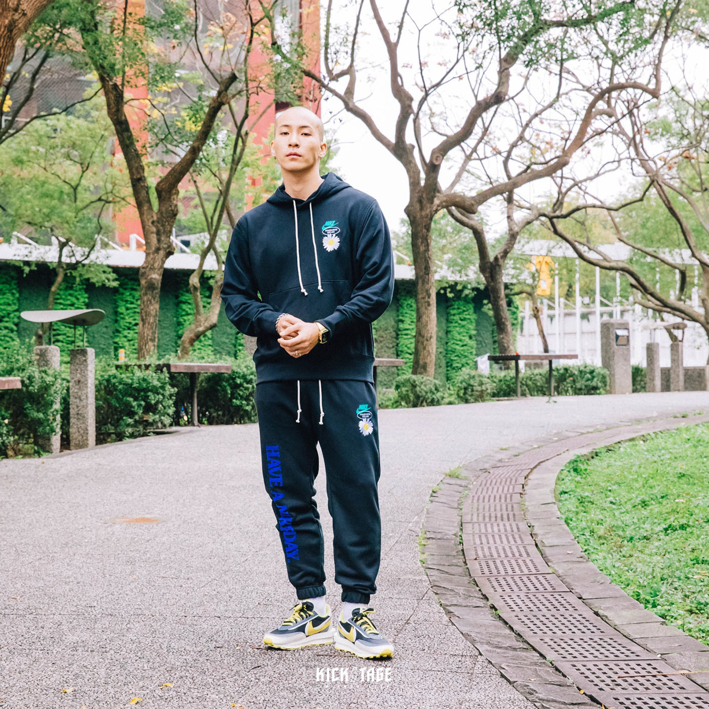 *特價商品售出不退換*男款 NIKE HOODIE 黑色 米黃色 雛菊 HAVE A NIKE DAY 標語 棉套裝 帽T【DM4994-010】棉褲【DM5015-010】perennis