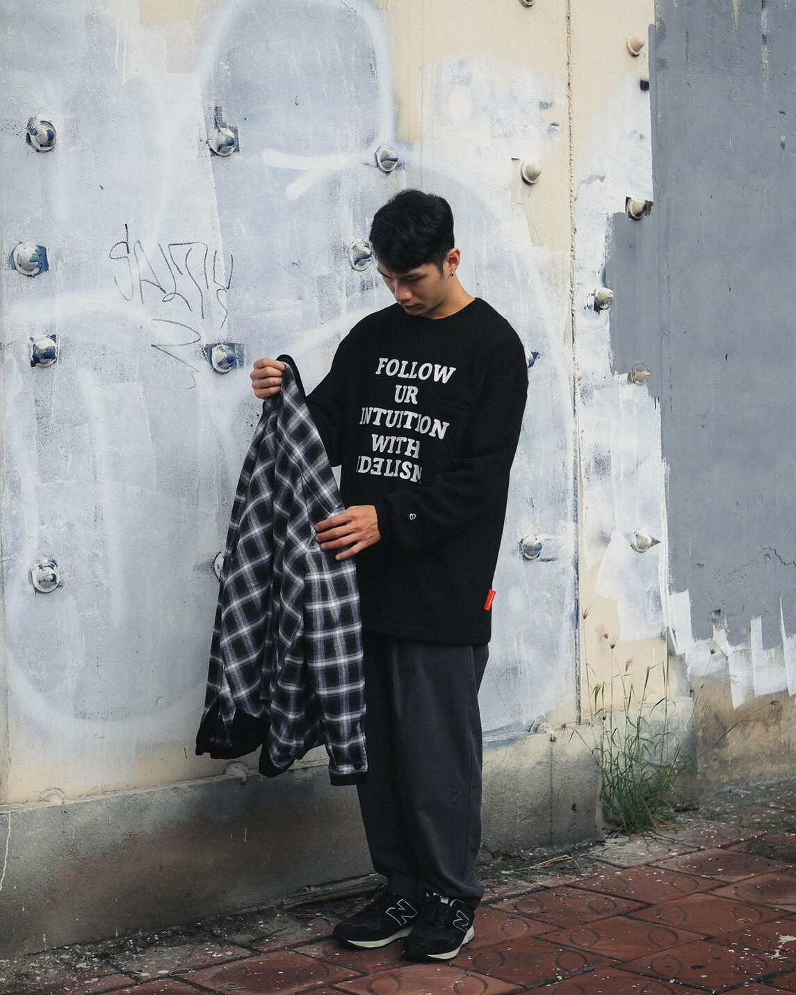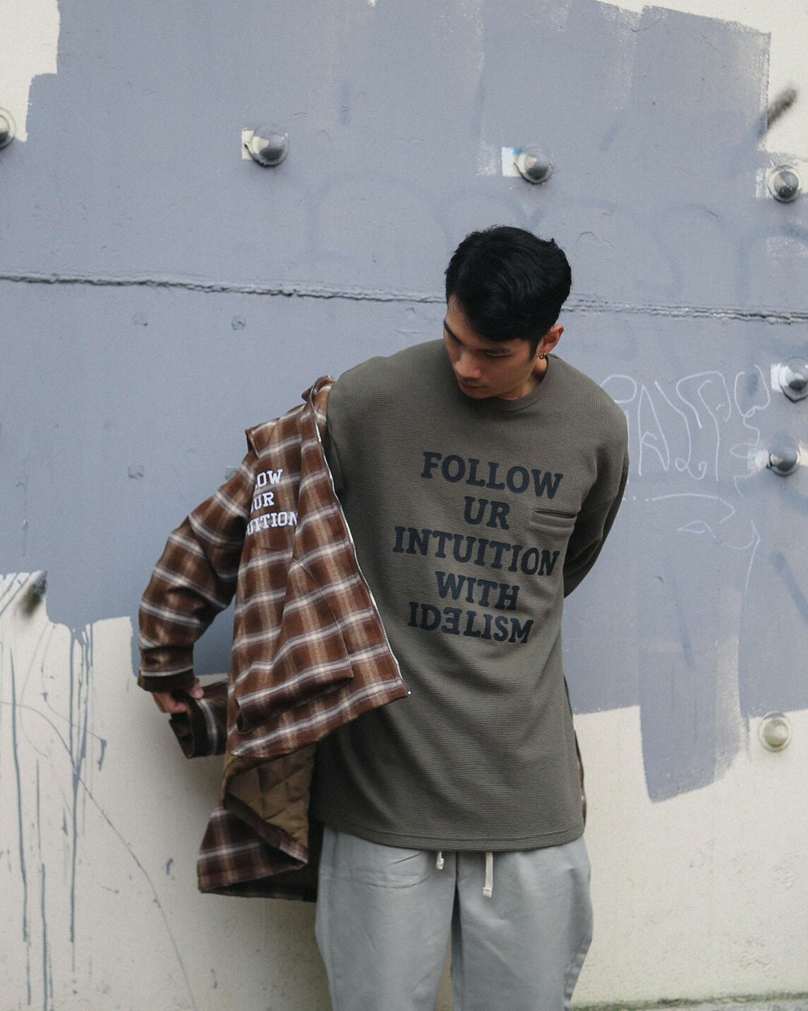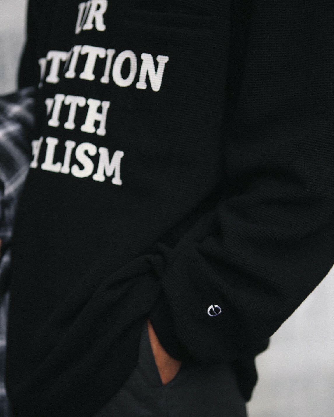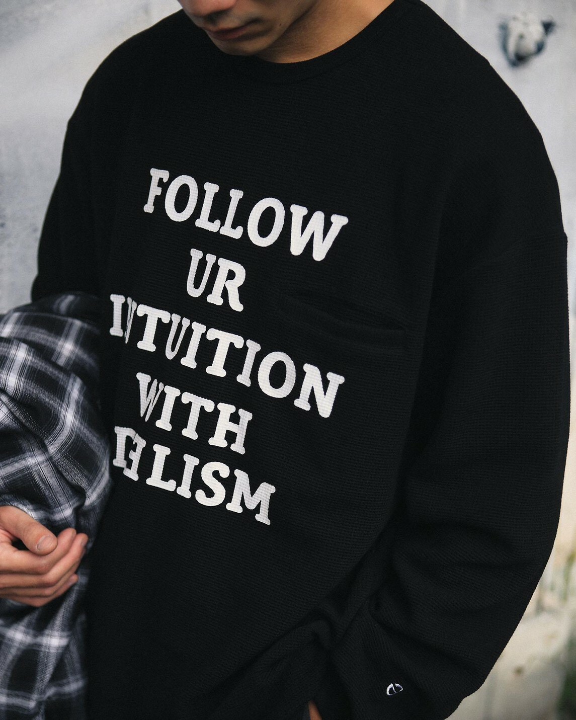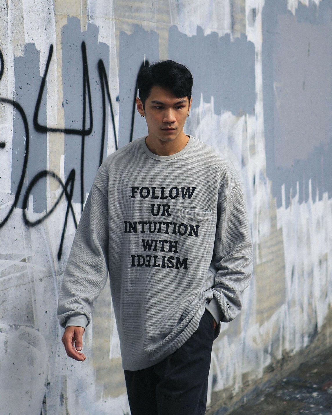在服裝的呈現上,將口袋巧妙安插於文字之間,夾帶著功能細節且簡約百搭。