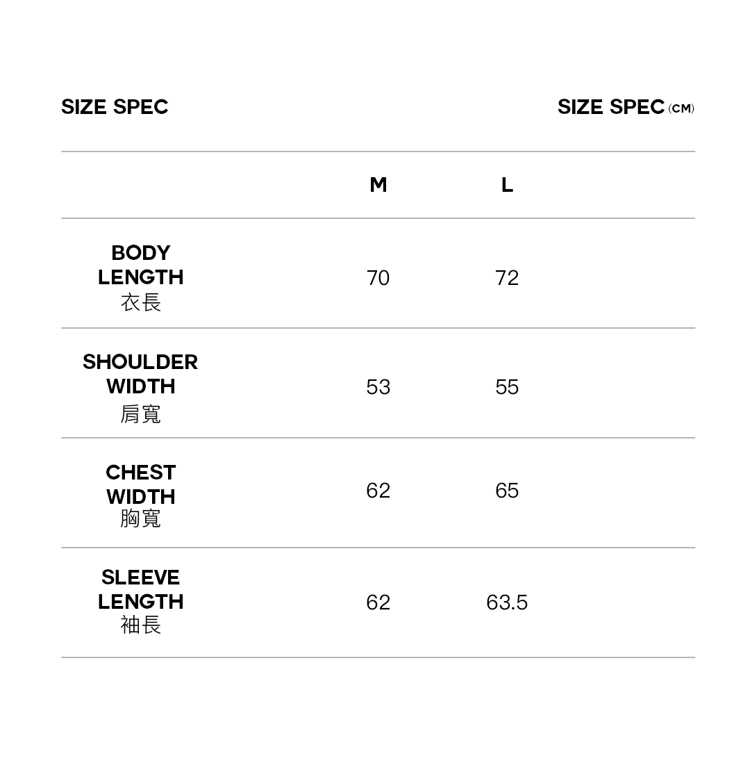 M 胸寬62 肩寬53 袖長62 衣長70 CM